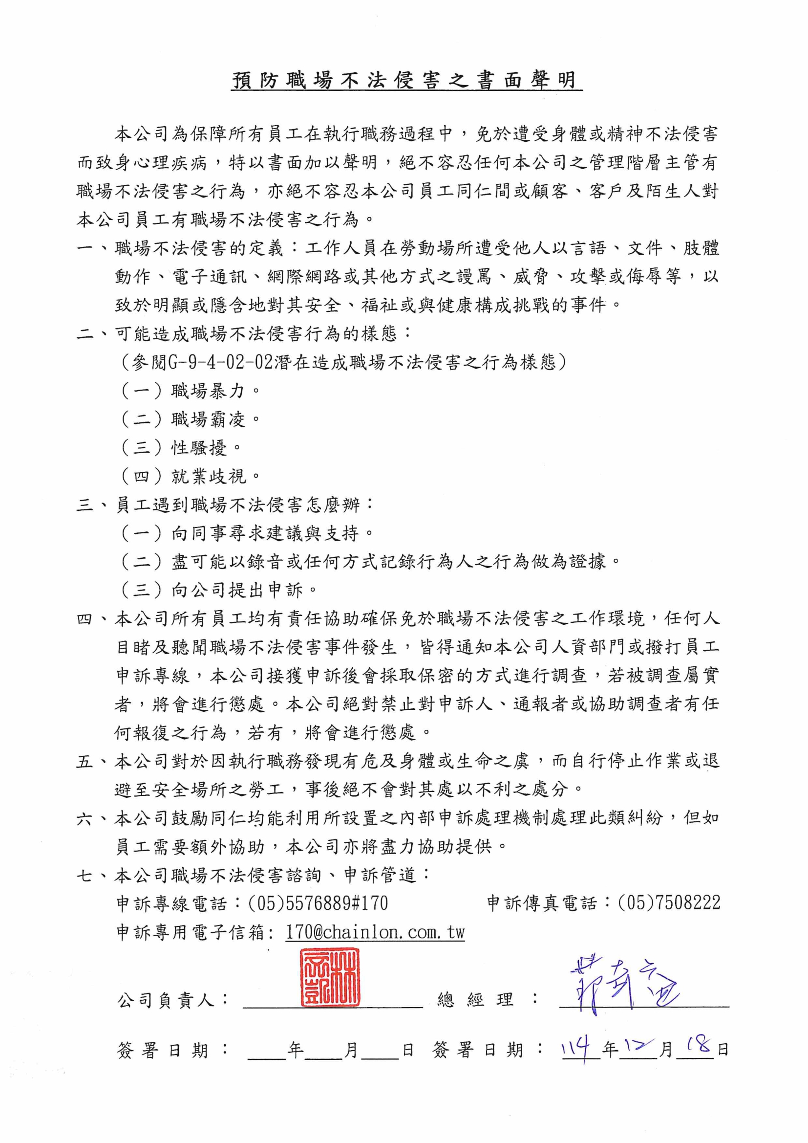 本公司為保障所有員工在執行職務過程中,免於遭受身體或精神不法侵害而致身心理疾病,特以書面加以聲明,絕不容忍任何本公司之管理階層主管有職場不法侵害之行為,亦絕不容忍本公司員工同仁間或顧客、客戶及陌生人對本公司員工有職場不法侵害之行為。